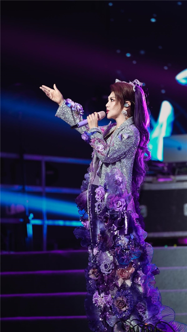 在大家的期待中,乌兰图雅带着温暖的笑容走上舞台。她身着缀满紫色玫瑰花的落地长裙,薄纱花瓣叠着珠光褶皱,像把千朵玫瑰揉进了岁月的柔光,走动时便漾成一片流动的紫雾,连话筒都裹着同色系的柔光。她以《送你一首吉祥的歌》开启了这场音乐之旅,高亢的歌声仿佛将草原的风吹过每个人的耳畔。“三亚的朋友们,你们好!今晚,我要把最美的祝福送到天涯海角!”她的问候如暖流般涌入观众心间。