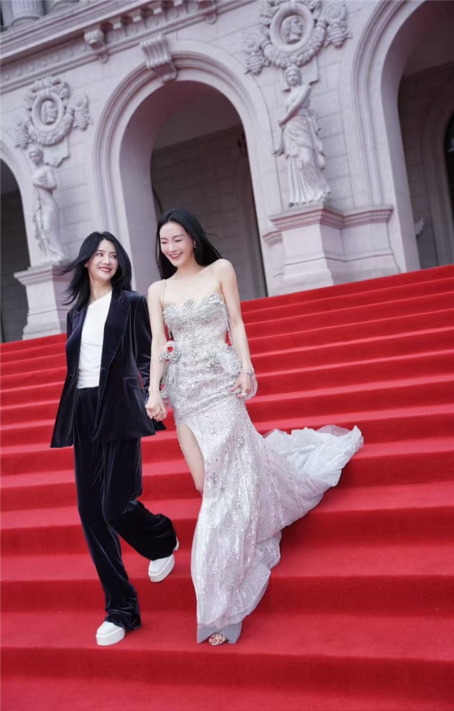 在文荣奖红毯上,孙晶晶的造型脱颖而出。银色亮面材质的拖尾裙贴合身形,既勾勒出窈窕曲线,又在灯光下折射出灵动光泽。与她同场亮相的张芷溪选择了黑色外套又美又飒。
