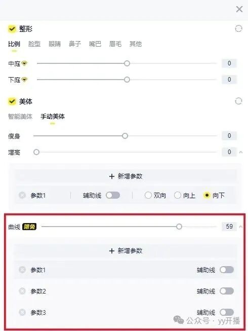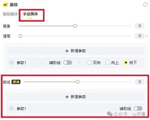 至于操作步骤,YY开播也延续了便捷易用的特点。主播只需在直播伴侣的美颜设置中,找到并勾选【美体】选项卡,选择【手动美体】下的曲线功能,再点击新增参数、勾选辅助线,将辅助线拉到要瘦身的位置,拉动曲线参数调节即可,简单几步就能开启专业美体体验。