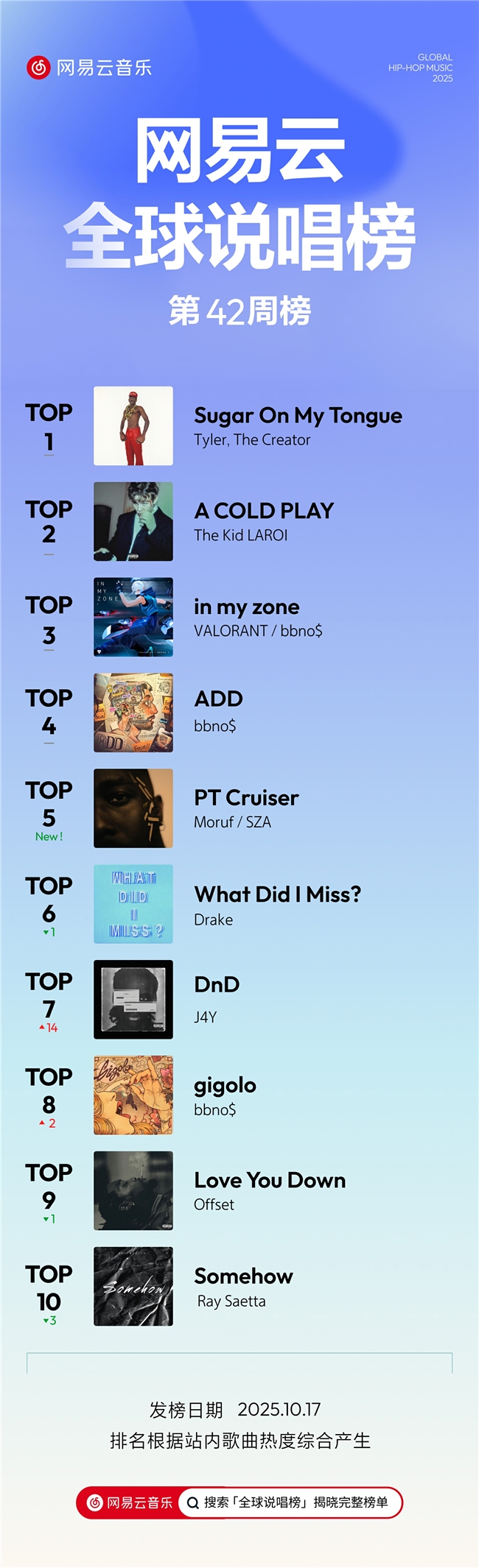 全球说唱榜方面,R&B歌手SZA惊喜助阵Moruf,两人合作新单《PT Cruiser》,发布仅两天便跻身榜单前五。Tyler, The Creator《Sugar On My Tongue》,The Kid LAROI《A COLD PLAY》不断发力,保持在榜单高位。采样自limbo《airplane mode》的《DnD》在短视频平台收获热度,排名攀升14名,来到榜单第七名。bbno$多首热单持续在榜,《in my zone》《ADD》《gigolo》分别位列第三位、第四位和第八位。