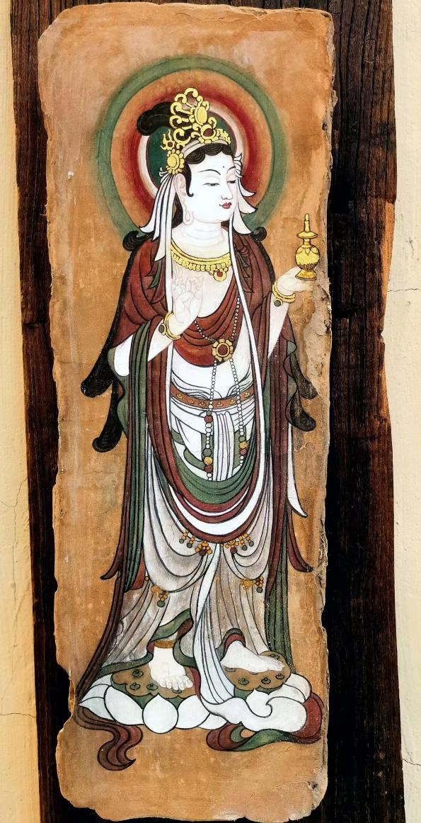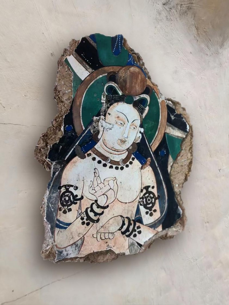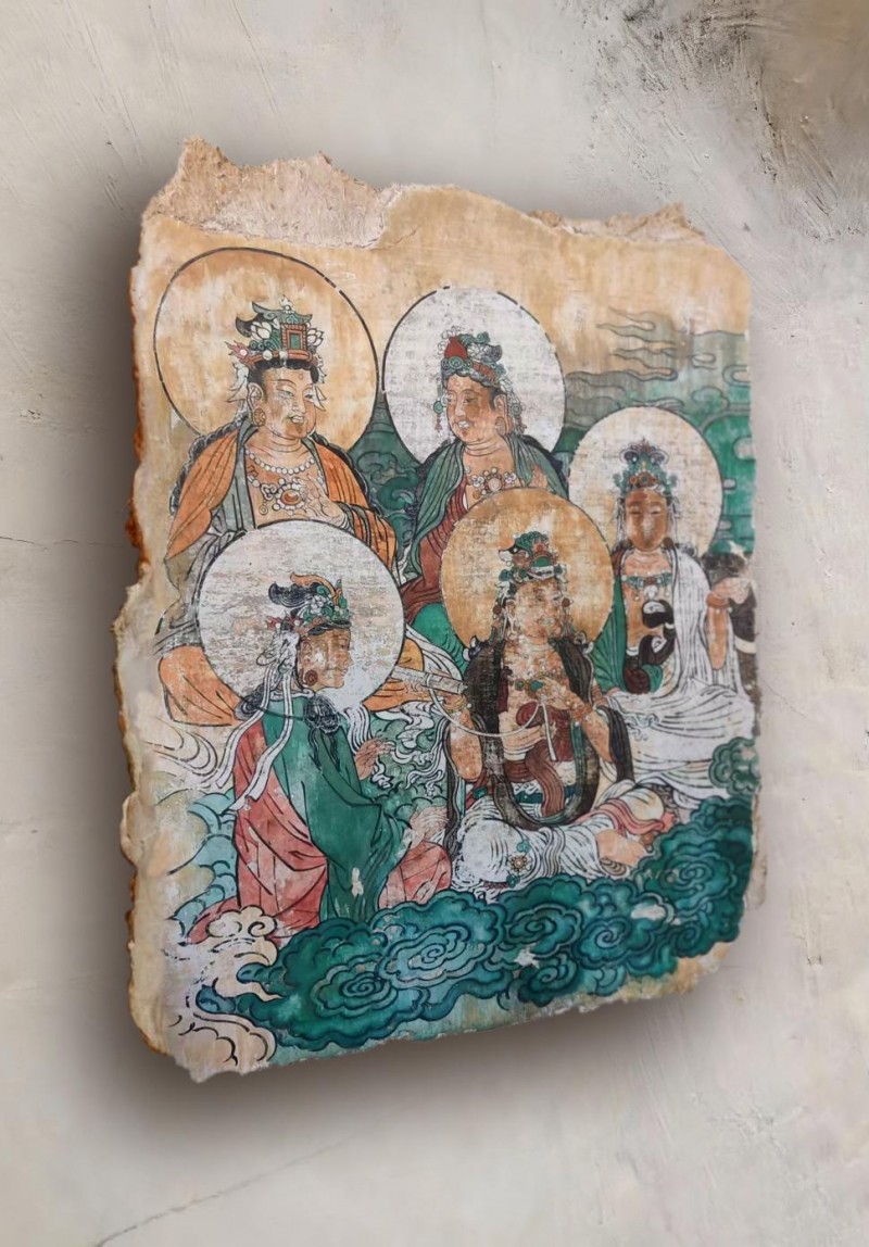 泥板壁画是中国画的源头,亦是中华传统文化的重要载体。党鹏程的泥板壁画创作,以敦煌、永乐宫、法海寺等经典壁画为核心题材,复刻与创新并重,每幅作品皆如从远古泥墙凿取而来,兼具历史厚重感与艺术独立性。 悬浮式独立泥板画壁的创新呈现,无疑是党鹏程创作之路的又一次全新突破,使得壁画的综合呈现方式有了更多可能。其技艺传承非遗秘术,从材料到工艺尽显匠心。十二层结构三种形制,以敦煌土、观音土为基底,搭配十余种内筋骨料筑牢底胎,选用千余种矿物色、金银箔等贵重画材沥粉设色,全程遵循古法地仗层造墙与绘制工艺流程;同时凝古法精髓、集众家所长,独创纯泥板悬空技法,让纯泥板壁画脱离硬质支撑、独立存在,并通过应力结构的骨架以及“太极扣”的悬挂系统,使泥板以竖立姿态悬浮于墙面,并保留5厘米的呼吸间隙,为“五蕴皆空”留下玄妙奥义之所在。更添神秘感、神圣感与尊贵感。在还原古人壁画精妙绝伦技艺的同时,探索国画工笔原始发展形态,借佛画心绘,体悟远古禅音。