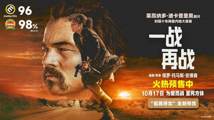 由保罗·托马斯·安德森编剧、执导并担任制片,莱昂纳多·迪卡普里奥领衔主演的年度大片《一战再战》今日开启预售,将于10月17日登陆内地大银幕。影片同步曝光“孤勇寻女”预告与中国独家海报,一场跨越十六年的宿命之战正式拉开帷幕。本片在第九届平遥国际电影展与海外放映时,均收获影史级罕见高分,大V推荐度98%、烂番茄新鲜度98%、MTC评分96,成为近十年综合评分最高的电影,被公认是这个10月必看的高品质大片,绝对值得期待。