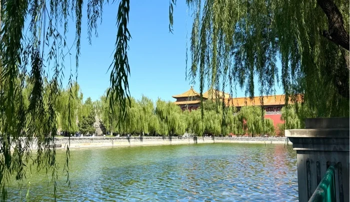 这幅画的灵魂,藏在 “借景” 的巧思里。远景稳稳 “借” 来午门的琉璃瓦建筑群,近景是右五分之二区域的古柏与柳树组群,用 “点子画法” 以密集点状笔触概括柳叶,疏密间透出树冠的体积感;中景以淡墨大笔扫过河水,不刻细纹,只留微风拂过的朦胧波纹;远景午门则以浅墨反复提线,墨色轻淡却不失建筑的庄重,避免抢了近景树木的生机。写生不是抄景,是把天地间的‘好关系’挪到纸上。陈威在直播中解释,这种构图延续了他对 “景与意” 的一贯思考,正如他 2023 年获央美优秀毕业创作最高奖的《龙雷》,亦是在绢本上让山水与意境共生,此次则让午门的历史厚重与公园的清幽形成时空对话。