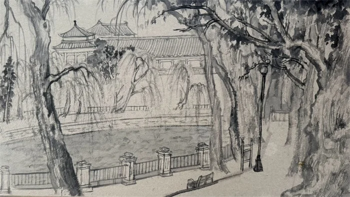 技法的细节里,更藏着对 “平衡” 的拿捏。柳树的刻画上,他让右侧柳树叶丛重色、树干亮色,左侧则反之,用明度反向对比建立画面呼应;古柏的树干以笔腰皴擦出历史痕迹,笔尖勾勒纤细分枝;染水面时,用饱和清水淡墨轻染一遍,让水色与天色相融;建筑屋顶最后以淡墨罩染,弱化细节却强化了空间纵深感。整幅画以灰淡墨为主,重墨仅用于点醒枝梢与建筑轮廓,笔墨圆润而不失苍茫,恰如中山公园的气质 —— 既有皇家园林的余韵,又有市井公园的鲜活。