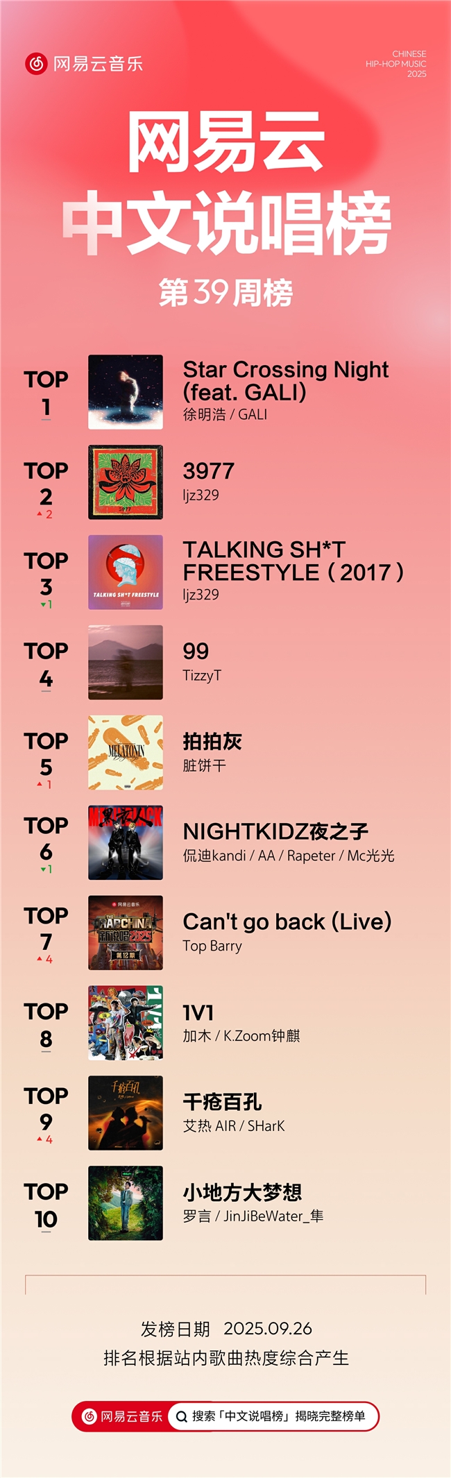 9月26日,网易云音乐发布2025年第39期说唱周榜。中文说唱榜方面,徐明浩与GALI的合作歌曲《Star Crossing Night》蝉联本周中文说唱榜榜首。Top Barry在《新说唱2025》中演唱的《Can't go back (Live)》以及艾热 AIR、SHarK合作的《千疮百孔》热度回升,重返榜单前十,分别位列榜单第七和第九。同时,TizzyT《99》、脏饼干《拍拍灰》持续位居榜单前五。加木近期连发多首新歌,与K.Zoom钟麒合作的《1V1》本周保持第八位。此外,他于9月20日发布新专《嵌入生长》,专辑中与马赫mood合作的《好坏》首次进入榜单便位居第十七位。