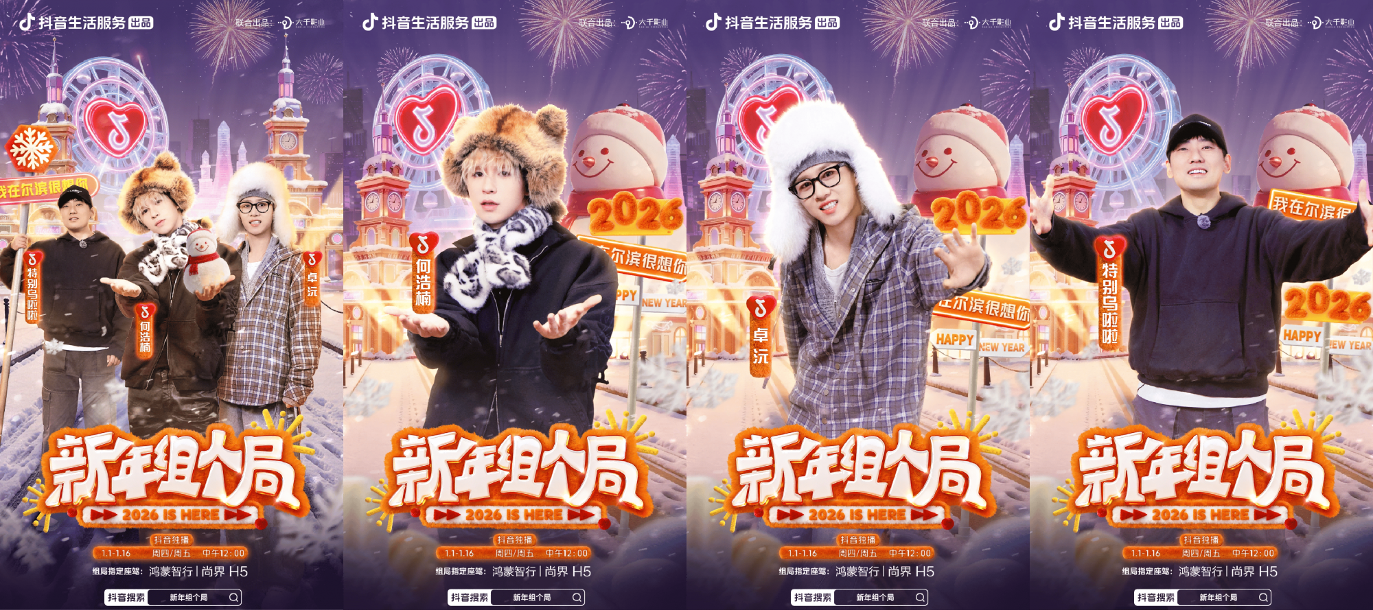 由抖音生活服务和大千影业联合出品的新年季生服场景定制小鲜综——《新年组个局》 已!经!开!播!1月1日起,每周四、周五,抖音独家放送,一周双更,快乐加倍! 常驻“局头”何浩楠,携飞行嘉宾卓沅、特别乌啦啦、陆虎、谢兴阳、苏醒、王勉,兵分三路,杀向哈尔滨、深圳、上海,上演画风清奇、爆笑满满的“新年组局之约”!
