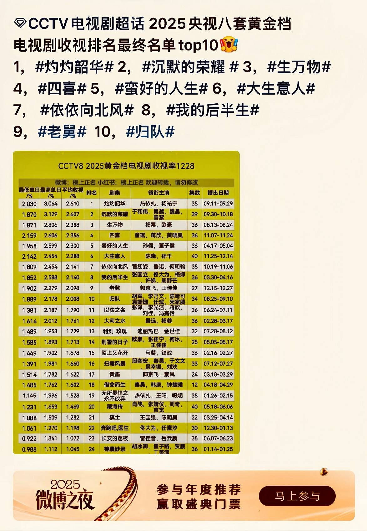 Top1,《灼灼韶华》是由四川光影在线文化传媒有限公司、优酷、阿里巴巴影业等联合出品,王锦工作室承制,余丁执导,苏晓苑编剧,热依扎、杨祐宁领衔主演,茅子俊、柴碧云、唐曾、宣言、田钰主演,涂松岩、邵峰、车永莉、巩峥等出演的女性年代传奇剧。该剧于2025年9月11日在中央电视台电视剧频道黄金档和优酷同步首播,平均收视2.610%。Top2,《沉默的荣耀》是由于和伟监制,杨亚洲执导,卢敏总编剧,于和伟、吴越、魏晨、曾黎领衔主演,余皑磊、隆妮、那志东、曹磊、郑家彬、封新天等主演的谍战纪实传奇剧。该剧于2025年9月30日在中央电视台电视剧频道首播,并在爱奇艺、咪咕视频同步播出,平均收视2.607%。Top3,《生万物》是由中央电视台、爱奇艺出品,尚羲传媒、洲际兄弟、高兴传媒、要有光传媒联合出品,刘家成执导,王贺编剧,杨幂、欧豪领衔主演,倪大红、秦海璐、邢菲、张天阳、张海宇、孙绍龙等主演的热土生长群像剧。该剧于2025年8月13日在中央电视台电视剧频道和爱奇艺播出 ,平均收视2.388%。Top4,《四喜》是由中央电视台、腾讯视频、瞳盟影视联合出品,沈严担任总导演、沈阳执导,蓝小汐编剧并与沈阳共同把握都市情感脉络,童瑶、蒋欣、黄明昊领衔主演,许娣、林晓杰、侯岩松、岳红特邀主演,付辛博、王菊、黄澄澄、宣言、马旭东特别出演的现实主义家庭情感剧。该剧于2025年11月7日在中央电视台电视剧频道和腾讯视频播出,平均收视2.356%。Top5,《蛮好的人生》是由尚世影业、优酷出品,汪俊执导,费慧君、李晓亮任编剧,孙俪、董子健领衔主演,胡杏儿、高鑫、陈瑶、徐崴罗、童蕾、叶青、胡明主演,邬君梅特别主演,张晨光、刘钧、冯雷、赵龙豪特别出演的都市民生话题剧。该剧于2025年4月17日在中央电视台电视剧频道和优酷播出,平均收视2.300%。Top6,《大生意人》是由爱奇艺、海棠果影业出品,海棠果影业制作,张挺编剧并执导,陈晓、孙千领衔主演,罗一舟、成泰燊联合主演,黄志忠、李纯特邀主演,朱亚文、向涵之、吴樾特别出演的古装传奇剧。该剧与2025年11月25日在央视电视剧频道和爱奇艺播出,平均收视2.228%。Top7,《依依向北风》是由武一鹤编剧,武洪武担任总导演,菅纫姿、鲁诺、何明翰领衔主演,铁政、张可盈、念真、甄琪、文熙等主演,王丽云、范雷、于莉红、马诗红等特别主演的年代情感剧。该剧由中央电视台、南京广播电视集团、江苏城市联合影视文化股份有限公司、北京哇咖咖文化传媒有限公司等联合出品。该剧于2025年10月19日在CCTV-8黄金档和爱奇艺、央视网等网络平台播出,平均收视2.141%。Top8,《我的后半生》是由腾讯视频出品,董富来执导,潘戍午联合执导,张国立、佟大为、梅婷、许娣、周野芒领衔主演,杨童舒、严晓频、丁嘉丽、邬君梅特别出演,张丰毅 、韩童生特邀主演的都市老年婚恋轻喜剧。该剧于2025年3月30日在中央电视台电视剧频道播出,并在腾讯视频同步播出,平均收视2.140%。Top9,《老舅》是由孔二狗、李奇星联合执导,韩三平、孔二狗编剧,韩三平监制,郭京飞、王佳佳领衔主演,陈明昊、张歆艺特邀主演,刘佩琦、刘奕铁特别出演的年代轻喜剧。该剧于2025年12月15日在CCTV-8首播,腾讯视频、爱奇艺同步上线,平均收视2.098%。Top10,《归队》是由国家广播电视总局重点指导,北京市广电局重点扶持,中央电视台、腾讯视频出品,无止境文化联合出品并承制,北京市广播电视局及辽宁、吉林、黑龙江省委宣传部联合制作,高满堂、李立、汝盛、李洲编剧,臧溪川、赵阳执导,胡军、李乃文、陈靖可、袁姗姗、任彬、宋家腾领衔主演,蒋欣特别出演,林永健、周铁、高子沣、艾东特邀主演的历史战争群像剧。该剧于2025年8月25日在央视八套黄金时段和腾讯视频首播,平均收视2.008%。