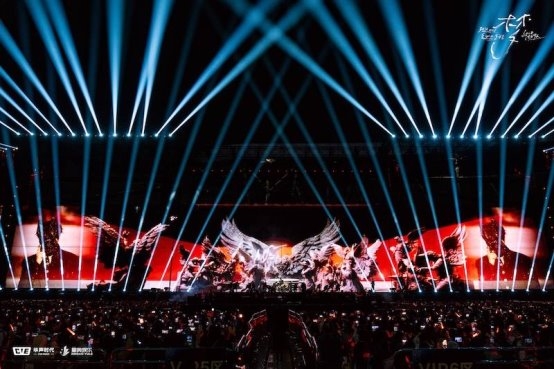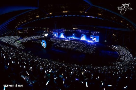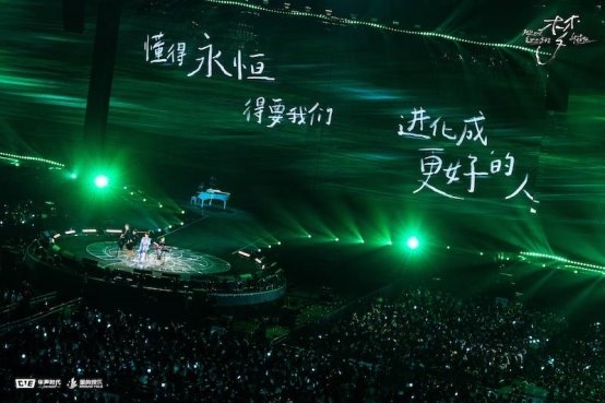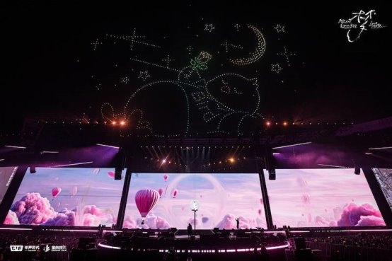 随后又通过千架无人机表演,在体育场上方变幻出呆鸟、白鸽、翅膀、元宝、爱心、飞翔手势等唯美图阵,与「南方秋野 北方春茶」、「我想借」、「星」、「仰望星云」四首歌曲的演绎完美呼应。