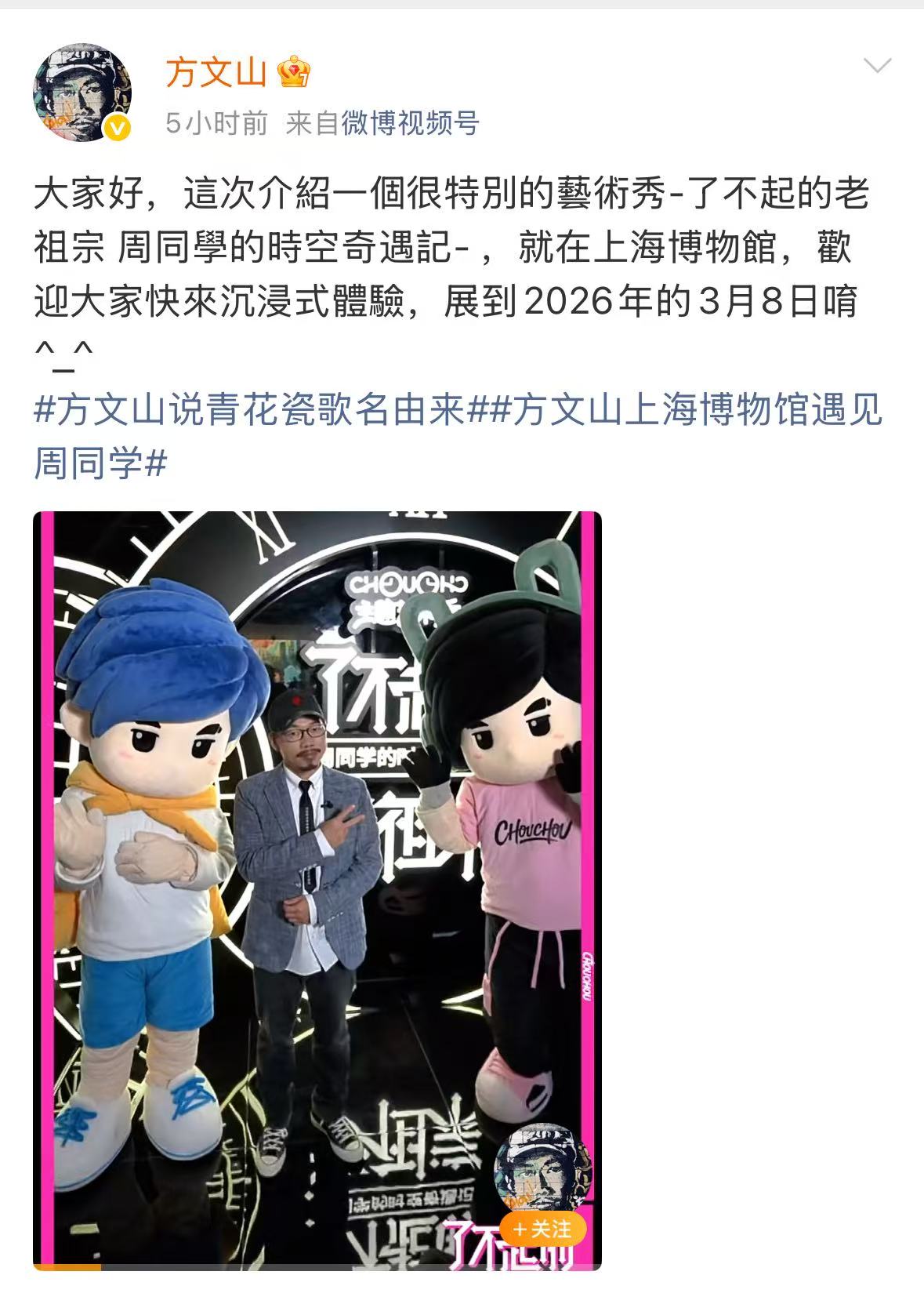 近日,知名作词人方文山在其社交平台上发布视频,热情推介一场正在上海博物馆举行的“了不起的老祖宗——周同学的时空奇遇记”主题艺术秀,邀请观众前来沉浸式体验这场将持续至2026年3月8日的文化盛宴。该视频迅速引发广泛关注,将大众目光聚焦于上海博物馆这场融合传统与潮流的创新实践。