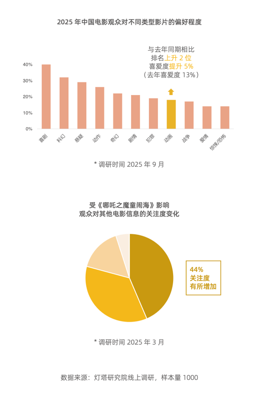 类型表现方面,动画电影表现突出,上映总数量略高于去年同期。《哪吒之魔童闹海》以现象级表现拉升大盘。灯塔研究院线上调研显示:《哪吒之魔童闹海》的火热不仅提升了观众对动画电影的偏好程度,其引发的观影热情更持续外溢至其他影片。调研数据显示,超四成观众表示受该片影响,对其它电影信息的关注度也有所增加。近半数观众坦言,在过去半年,“支持国产动画”是其走进影院的重要动因之一。
