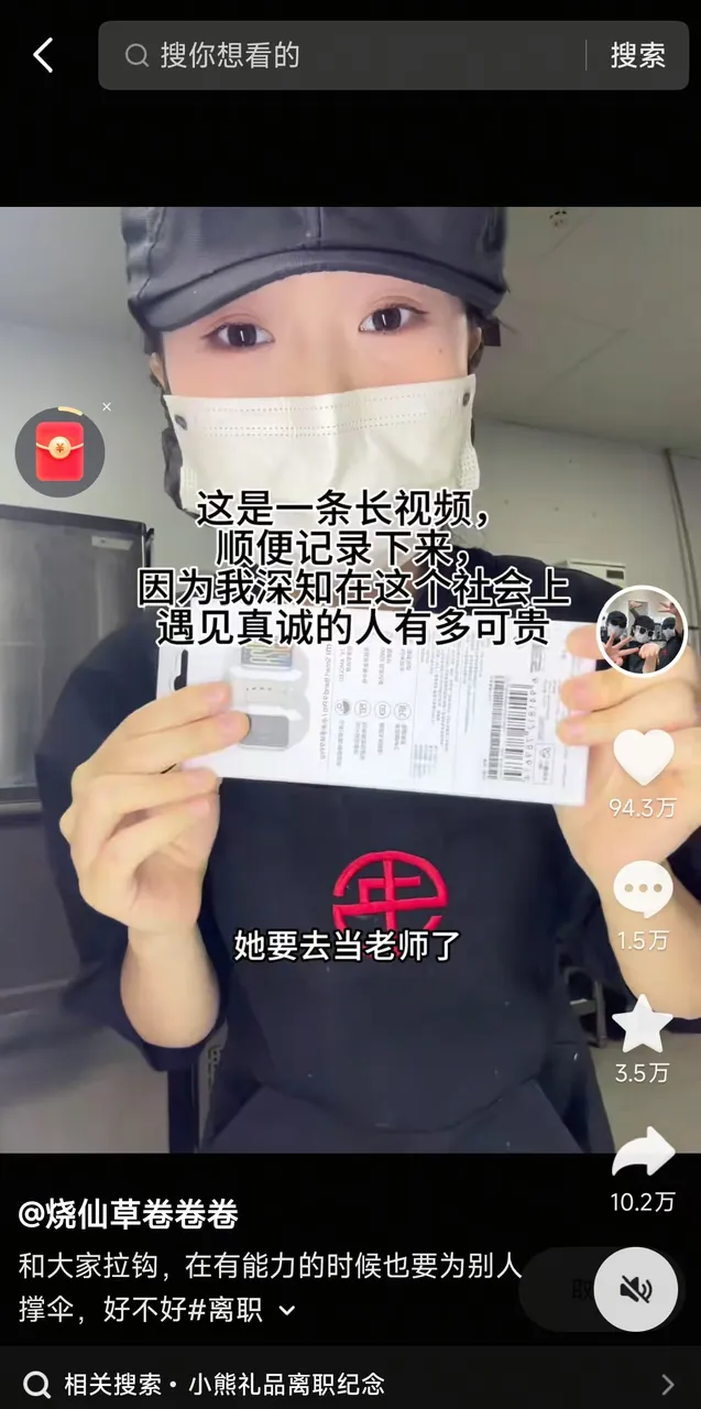 视频中,卷卷送完礼物后评价:“她不属于小县城的奶茶店,应该有更好的出路。”兴许正是卷卷的“温暖”集中的粉丝的内心,这条记录小熊离职的视频竟然意外火出圈,目前收获了1750+ 万次播放和 94 万的点赞。
