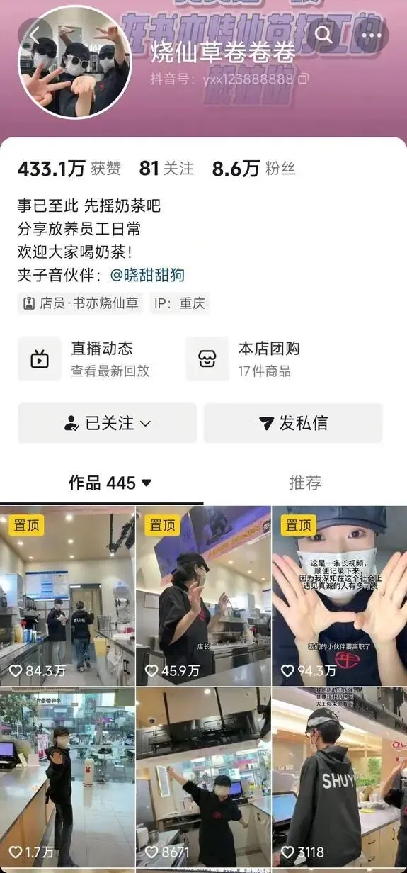 据了解,书亦烧仙草在抖音有不少类似的职人账号,她们像卷卷一样,既对新媒体感兴趣,也希望能通过视频帮助门店带来一些客流和销量。