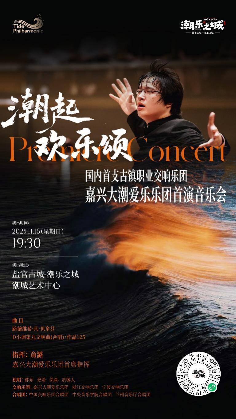 当钱塘江大潮的磅礴与贝多芬《第九交响曲》的恢弘在盐官古城-潮乐之城相遇,一场打破艺术边界的里程碑文化盛事——“‘潮起・欢乐颂’——国内首支古镇职业交响乐团嘉兴大潮爱乐乐团首演音乐会”将于11月16日在盐官潮城艺术中心隆重登场。