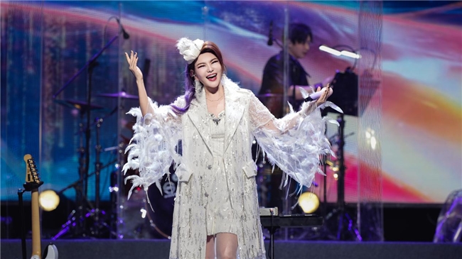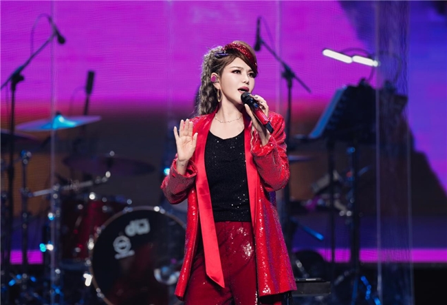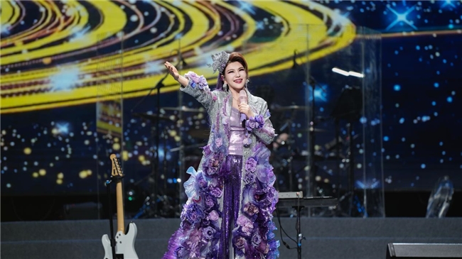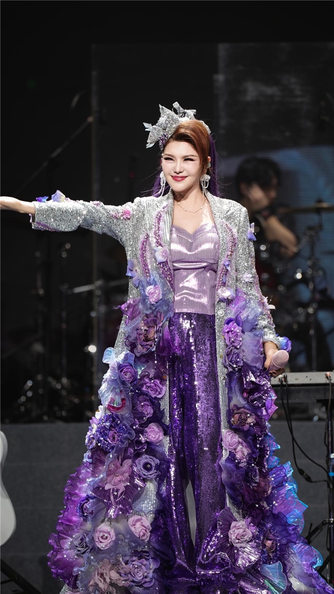 在大家的期待中,乌兰图雅带着温暖的笑容走上舞台。她身着缀满紫色玫瑰花的落地长裙,薄纱花瓣叠着珠光褶皱,像把千朵玫瑰揉进了岁月的柔光,走动时便漾成一片流动的紫雾,连话筒都裹着同色系的柔光。她以《送你一首吉祥的歌》开启了这场音乐之旅,高亢的歌声仿佛将草原的风吹过每个人的耳畔。“三亚的朋友们,你们好!今晚,我要把最美的祝福送到天涯海角!”她的问候如暖流般涌入观众心间。