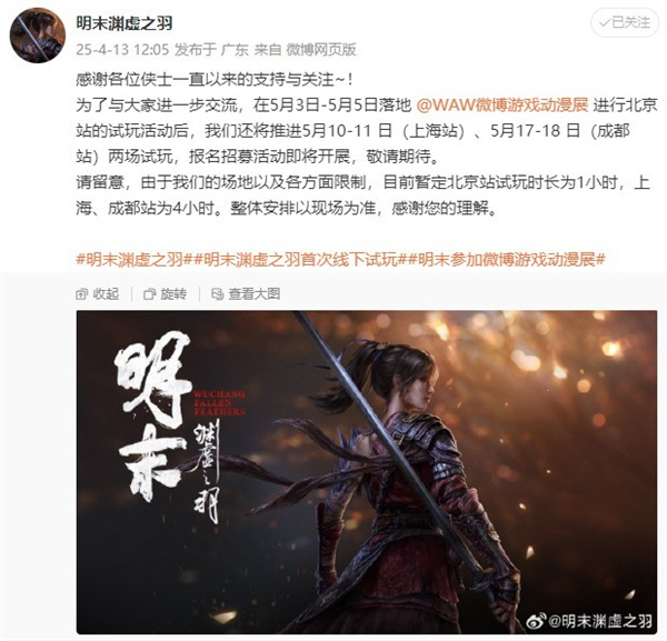 《明末:渊虚之羽》还将推进5月10-11日(上海站)、5月17-18日(成都站)两场试玩,报名招募活动即将开展。由于场地以及各方面限制,目前暂定北京站试玩时长为1小时,上海和成都站为4小时,整体安排以现场为准。