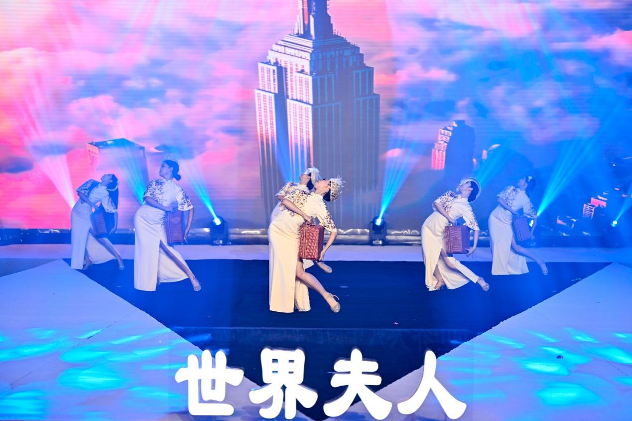 第二篇章“东方情韵”中,六名舞蹈演员身着精致旗袍,手持民国复古行李箱,以细腻深情的舞蹈语言,演绎了全球华侨深切的思乡之情。随后,20多位世界夫人选手化身为大唐盛世的使者,将传统京剧精髓与现代改良东方美学巧妙融合,展现出跨越时空的东方韵味与典雅气质。