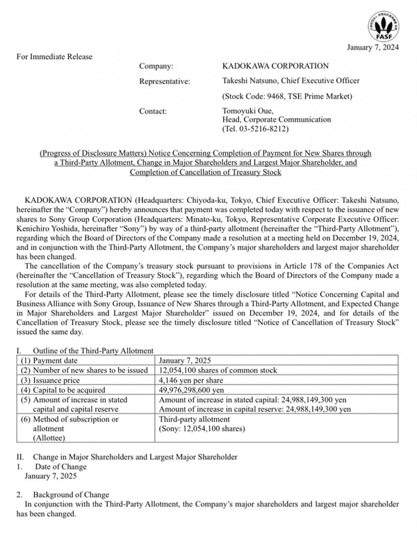 “角川株式会社特此宣布,关于公司董事会于2024年12月19日召开会议时做出决议的通过第三方配售方式向索尼集团公司发行新股一事,今天已完成支付。伴随此次定向增发,公司的主要股东和最大股东已发生变更。”