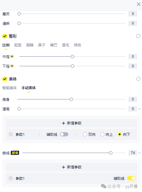 至于操作步骤,YY开播也延续了便捷易用的特点。主播只需在直播伴侣的美颜设置中,找到并勾选【美体】选项卡,选择【手动美体】下的曲线功能,再点击新增参数、勾选辅助线,将辅助线拉到要瘦身的位置,拉动曲线参数调节即可,简单几步就能开启专业美体体验。