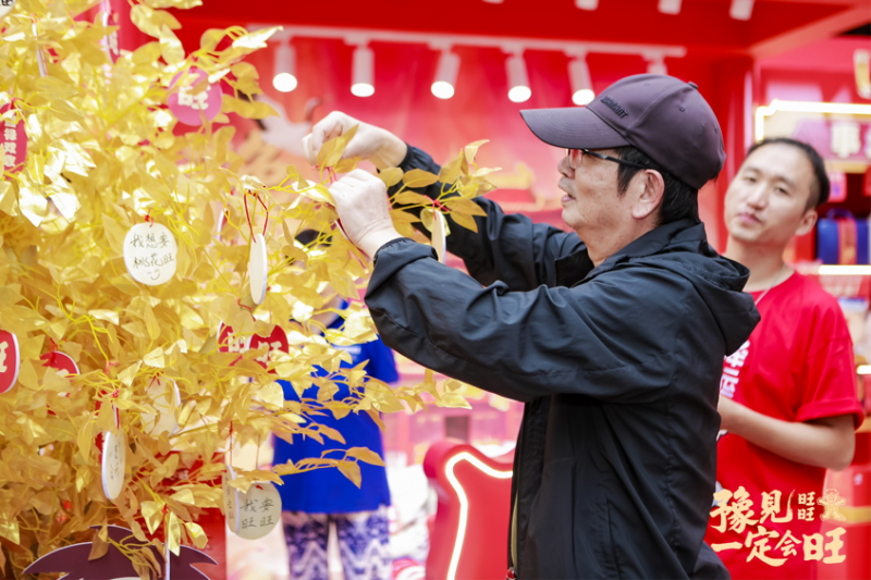 快闪店整体采用中式复古风格,店内正中矗立着立体发光“旺”字美陈,左侧金色祈旺树上挂满雪饼、仙贝造型的祈旺卡;右侧设置“指定会旺”打卡点,财神旺仔人偶指向拍照者,加上“这个人今年会很旺”的标语,成为游客拍照互动最集中的区域。值得注意的是,店内墙面巧妙融入“财运旺、事业旺、身体旺、桃花旺”等文字,将零食消费与年轻人热衷的“玄学祈福”心理绑定。而店外华宝楼二楼高达3米的发光巨型旺仔,更在夜间成为豫园商圈的地标性景观,强化了品牌形象的视觉冲击力。