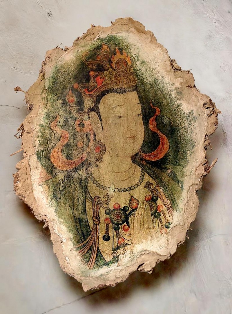 泥板壁画是中国画的源头,亦是中华传统文化的重要载体。党鹏程的泥板壁画创作,以敦煌、永乐宫、法海寺等经典壁画为核心题材,复刻与创新并重,每幅作品皆如从远古泥墙凿取而来,兼具历史厚重感与艺术独立性。 悬浮式独立泥板画壁的创新呈现,无疑是党鹏程创作之路的又一次全新突破,使得壁画的综合呈现方式有了更多可能。其技艺传承非遗秘术,从材料到工艺尽显匠心。十二层结构三种形制,以敦煌土、观音土为基底,搭配十余种内筋骨料筑牢底胎,选用千余种矿物色、金银箔等贵重画材沥粉设色,全程遵循古法地仗层造墙与绘制工艺流程;同时凝古法精髓、集众家所长,独创纯泥板悬空技法,让纯泥板壁画脱离硬质支撑、独立存在,并通过应力结构的骨架以及“太极扣”的悬挂系统,使泥板以竖立姿态悬浮于墙面,并保留5厘米的呼吸间隙,为“五蕴皆空”留下玄妙奥义之所在。更添神秘感、神圣感与尊贵感。在还原古人壁画精妙绝伦技艺的同时,探索国画工笔原始发展形态,借佛画心绘,体悟远古禅音。