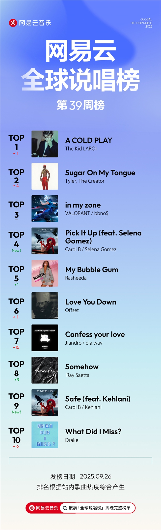 9月26日,网易云音乐发布2025年第39期说唱周榜。中文说唱榜方面,徐明浩与GALI的合作歌曲《Star Crossing Night》蝉联本周中文说唱榜榜首。Top Barry在《新说唱2025》中演唱的《Can't go back (Live)》以及艾热 AIR、SHarK合作的《千疮百孔》热度回升,重返榜单前十,分别位列榜单第七和第九。同时,TizzyT《99》、脏饼干《拍拍灰》持续位居榜单前五。加木近期连发多首新歌,与K.Zoom钟麒合作的《1V1》本周保持第八位。此外,他于9月20日发布新专《嵌入生长》,专辑中与马赫mood合作的《好坏》首次进入榜单便位居第十七位。
