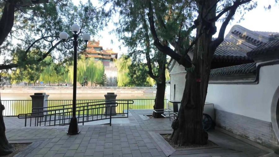 近景古柏重墨见筋骨,中景河面淡墨显灵动,远景西华门虚墨藏韵味。银笺的亮,让虚的更虚,实的更实,这就像中山公园的历史,社稷坛的过往是‘实’,西华门的光影是‘虚’,笔墨要做的,就是让两者共生。