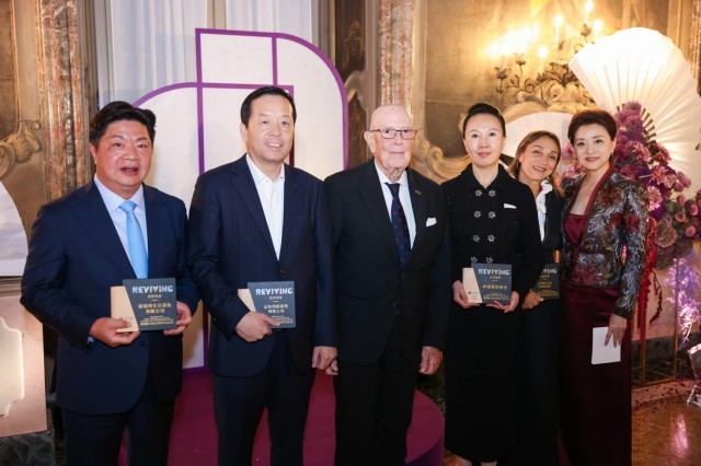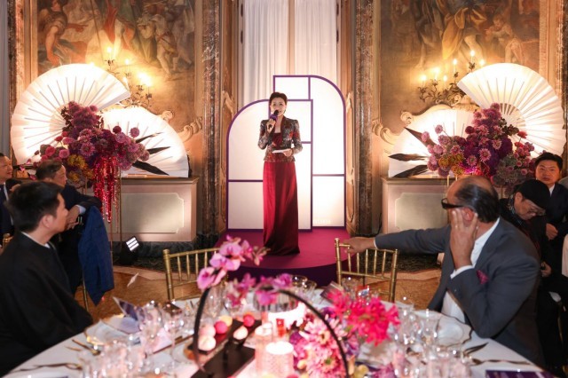 当地时间10月3日晚,意大利米兰维斯康蒂宫华灯璀璨,2025“新生万物——中国非遗与当代设计展”(以下简称“新生万物米兰展”)中意文化之光晚宴在此举行。阳光媒体集团董事长、“新生万物”系列展览联合策展人杨澜,中华人民共和国驻米兰总领事刘侃,意大利中国理事基金会主席马里奥·博塞利(Mario Boselli),世界知名电影与舞台美术指导、服装设计师和视觉艺术家叶锦添等来自中意两国政要、文化、商业、艺术与时尚等领域的代表齐聚一堂,在这场融美食、美酒、京剧、歌剧、非遗表演等多重艺术的文化盛筵中,感受中国非遗的当代魅力与创新表达。