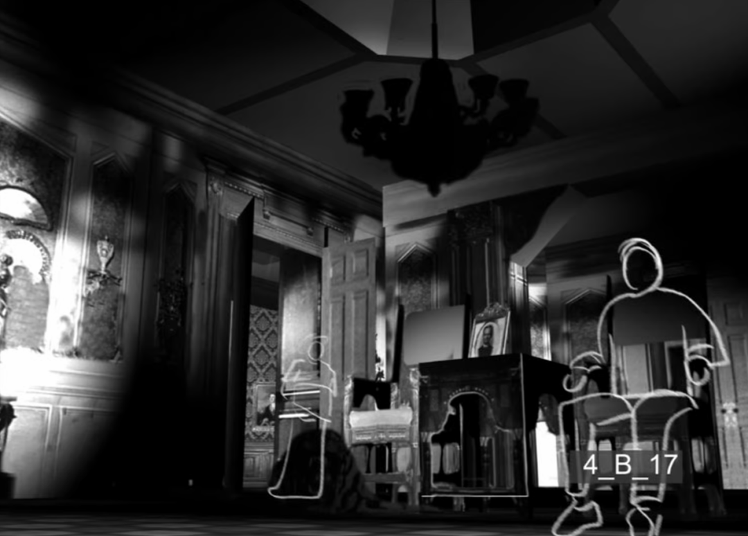 在重建的3D场景中,罗斯煞费苦⼼地推算出了威尔斯设计的那些标志性的、复杂的⻓镜头和摄影机运动轨迹。