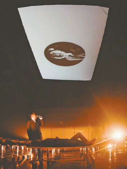 因为剧名的青年文化特征和形式的新颖,“新浪潮戏剧”导演王翀的《躺平2.0》今年格外吸睛。这个每场只有24位观众的作品,是他与人工智能联合编剧、让观众“躺着看”的戏。按照要求,观众入场前要脱掉鞋袜、寄存手机,然后如同要进入医院的病人,躺在演员推来的滚轮床上依次被接入剧场。开场后,他们被演员推床换位,分组相互观看,向AI提问,并在摄像机的压迫下接受关于自己墓志铭设想的现场随机采访,同步影像被传输到剧场顶棚,成为其他观众躺着看的对象。由此,在“躺平”与“死亡”的双关话题中,他们不仅仅是观众,也参与了表演。从本质上看,《躺平2.0》是一场创造全新剧场体验的戏剧游戏。
