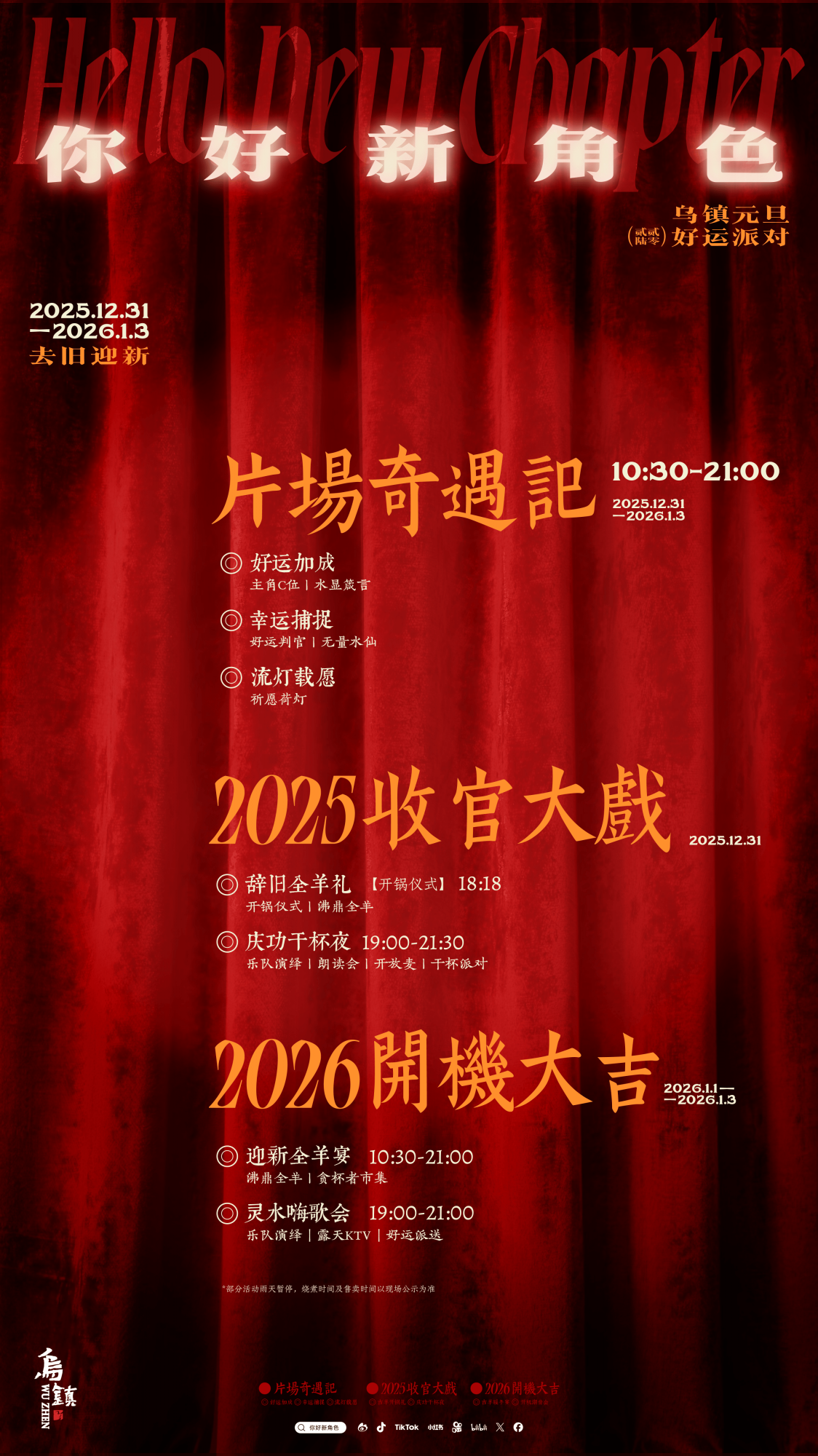 当2025年的日历即将翻至尾页,一场关于“告别”与“启程”的年度仪式,正在千年水乡乌镇温暖酝酿。2025年12月31日至2026年1月3日,乌镇景区以“你好,新角色—— 2026乌镇元旦好运派对”为主题,倾情呈献三大板块的跨年元旦盛宴。在这里,游客将沉浸于一场开放式的“人生剧本”,告别旧岁标签,拥抱新年可能;在“片场奇遇”中捕捉好运,于“收官大戏”里酣畅干杯,最终在“开机吉时”迎光启程。这不仅是一场节日欢聚,更是一次关于自我焕新的沉浸式旅程,邀请各位游客在悠悠古韵与当代活力中,开启风风火火的新年序幕。