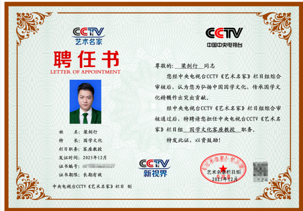 12月31日,知名企业家梁剑行受邀请担任中央电视台CCTV《艺术名家》及《CCTV新视界》国学文化客座教授。这一跨界任命标志着传统文化传承与当代商业实践的一次创新融合为国学文化的现代传播注入了新活力。