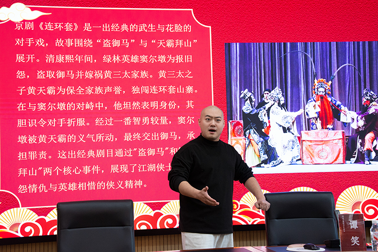 中国国家京剧院优秀青年京剧演员谭笑老师的《“国粹·京剧文化”》课程,为学员们呈现了一场精彩绝伦的京剧文化盛宴。谭老师从京剧的起源、发展讲起,结合经典剧目片段,详细解读京剧的唱腔、念白、做功、打斗等艺术特点。他还现场示范京剧的身段与表演技巧,让学员们近距离感受国粹的魅力。在互动环节,学员们踊跃上台学习京剧基本动作,现场气氛热烈,掌声不断。谭老师的授课不仅让学员们深入了解京剧文化,更激发了大家对传统艺术的热爱与传承意识。