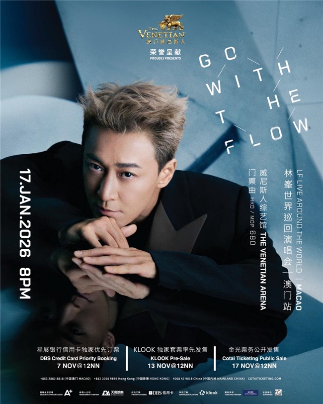 (中国澳门,2025年11月14日)– 中国香港艺人林峯将于2026年1月17日登陆澳门威尼斯人®的威尼斯人综艺馆,举办“GO WITH THE FLOW林峯世界巡回演唱会澳门站”。演唱会门票将于2025年11月17日(星期一)中午12时起通过金光票务、澳门售票网及大麦网公开发售。