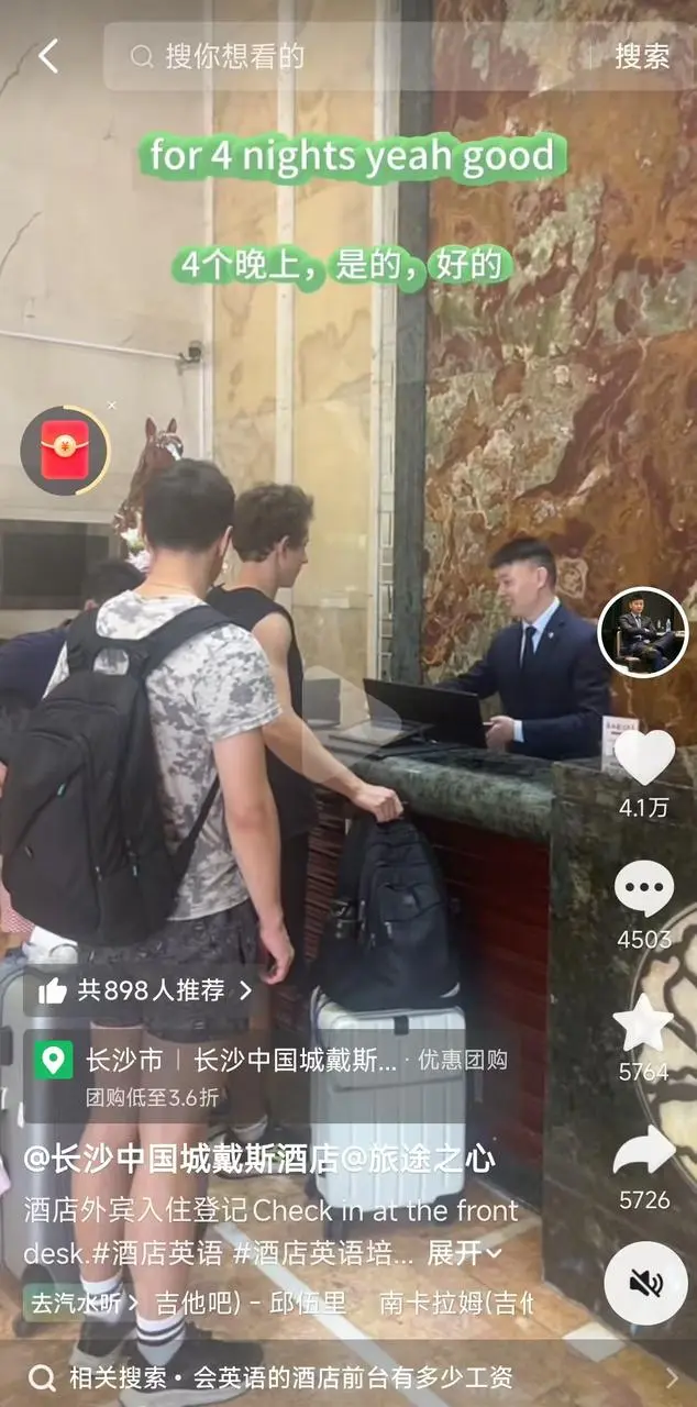 视频走红让马益兵大受启发,“涉外属性是我们酒店独有的优势” ,后续他又连续更新了十几条“接待外国人”的视频,均表现不俗,最好的一条点赞量超 4 万。